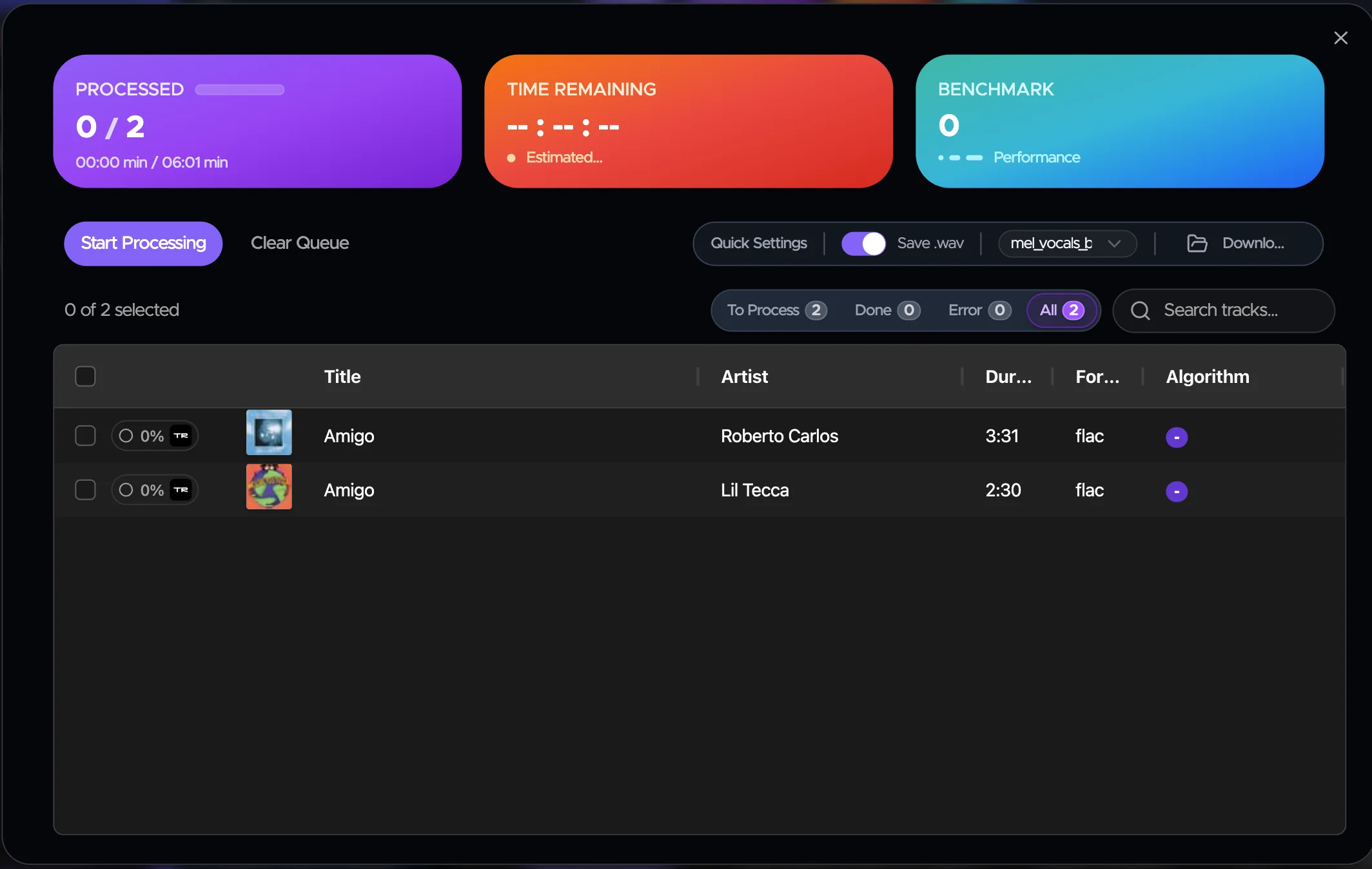 View and manage all your STEMS generations in the Queue. Monitor progress, pause, resume, or cancel operations as needed.